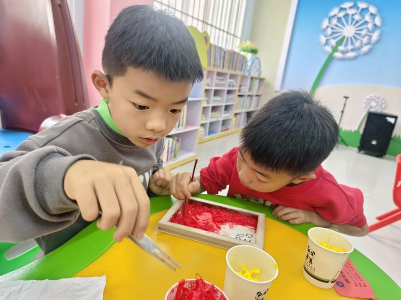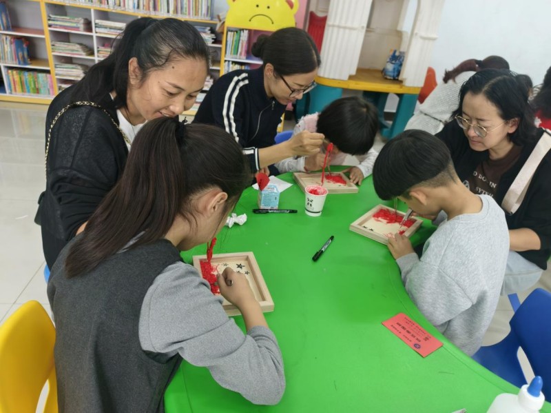 亲子手工环节温馨而有意义。家长们陪伴孩子一起动手创作:有的家庭选择制作纸浆画国旗,用红黄两色的纸浆细心粘贴出鲜艳的五星红旗;有的家庭则精心制作中秋灯笼,装饰完成后点亮温暖灯光。在亲密协作中,不仅锻炼了孩子们的动手能力,更让爱国情怀与团圆意识深入童心。