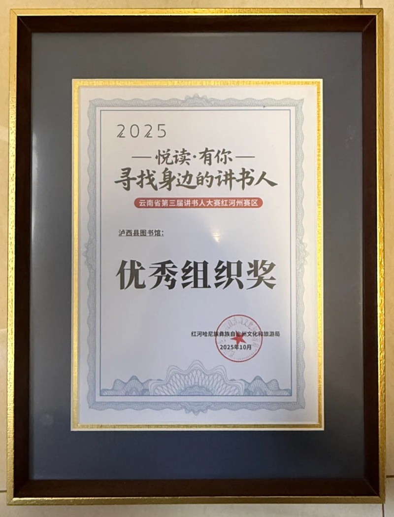 在近期举办的“悦读·有你——寻找身边的讲书人”云南省第三届讲书人系列活动红河州赛区线上选拔赛中,泸西县图书馆推选的选手表现优异,成绩斐然,共荣获多个个人奖项,泸西县图书馆也凭借出色的组织工作荣获“优秀组织奖”。