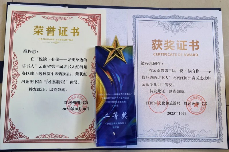 荣获由红河州文化和旅游局、红河州图书馆颁发的二等奖证书、奖杯及“阅读新星”称号。