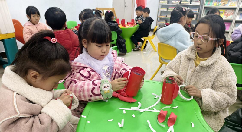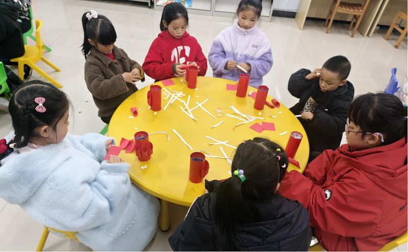手工环节充满了浓浓的节日喜庆氛围。在老师的指导下,孩子们动手制作寓意吉祥的“红灯笼”。他们认真地折叠红色卡纸,细心地粘贴装饰,最后挂上金色的流苏,一盏盏精巧可爱的小灯笼便在手中诞生了。孩子们兴奋地展示着自己的作品,有的还写下了新年愿望。通过亲手创作,孩子们不仅锻炼了动手能力和耐心,更将对新年的期待与对“幸福”的理解,融入了这盏可以点亮、可以带回家的节日灯笼中。