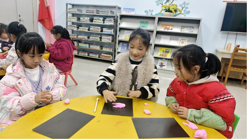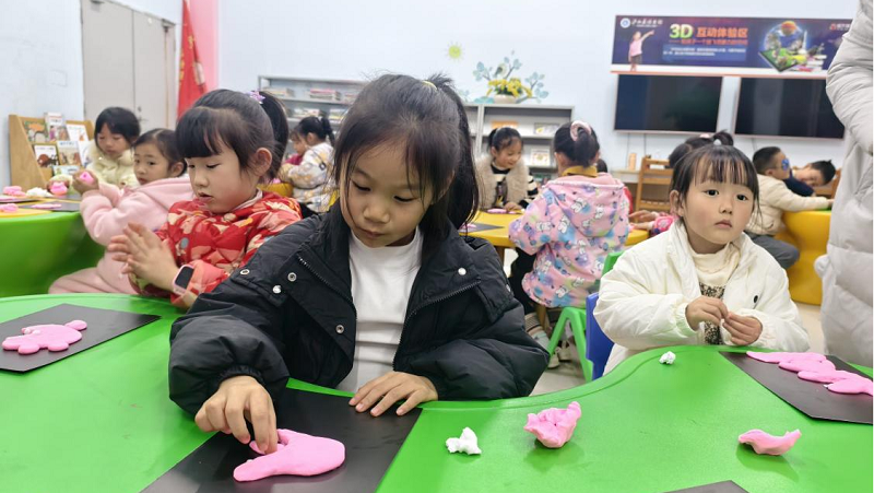手工环节中,孩子们用彩色纸黏土亲手制作“爱哭公主”。大家认真揉捏、塑形,创作出各具特色的公主形象。有的捏出了带着微笑的公主,有的则塑造出正在思考或平静模样的造型。通过动手创作,孩子们不仅锻炼了手部协调能力,也将对情绪的理解融入作品之中,在捏塑过程中进一步感受“情绪可以表达,也可以转化”的温暖寓意。