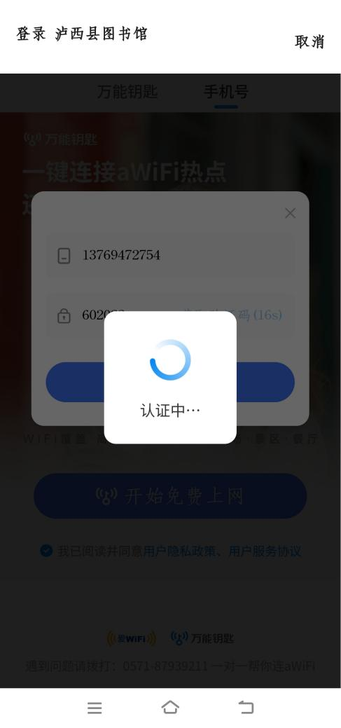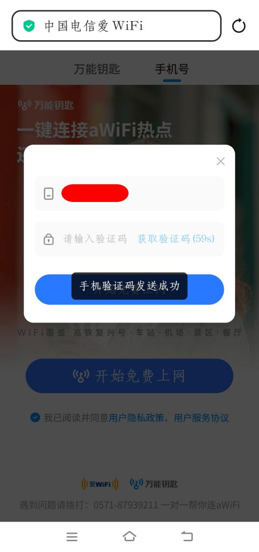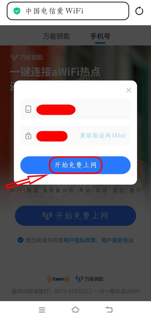查看手机短信,输入收到的验证码,点击“开始免费上网”。