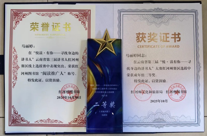 荣获由红河州文化和旅游局、红河州图书馆颁发的二等奖证书、奖杯及“阅读推广人”称号。