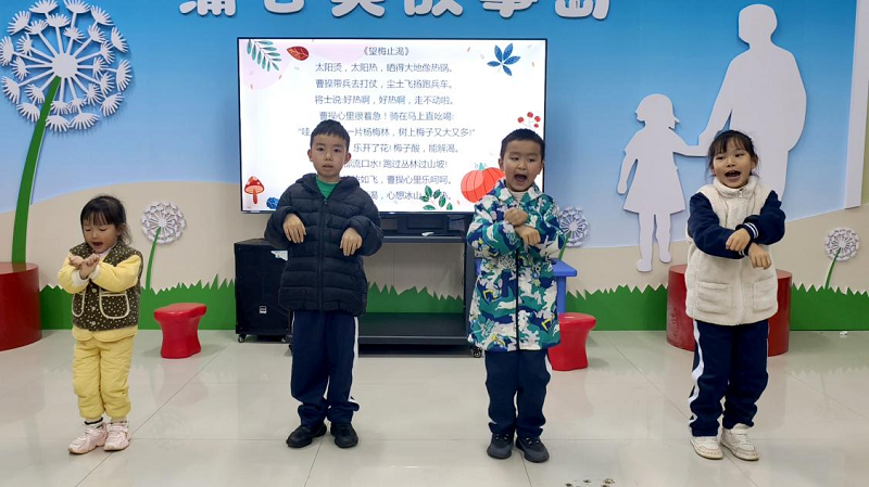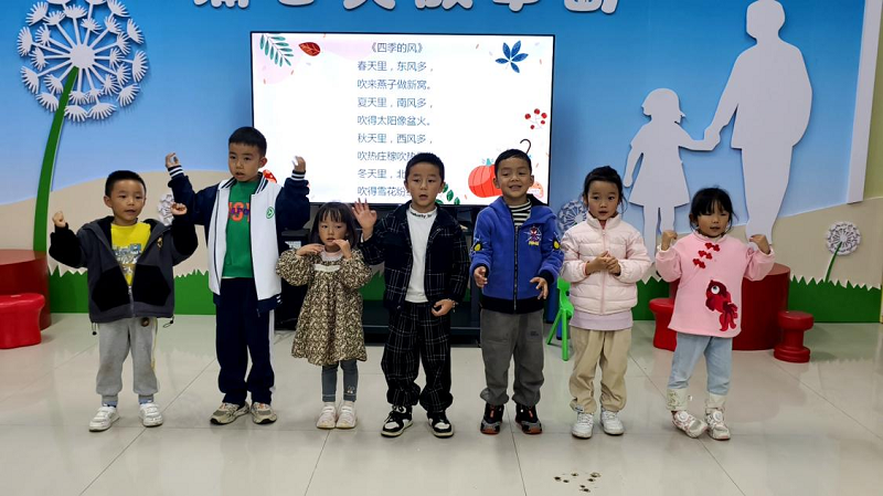 通过游戏化、情境化的教学设计,孩子们从最初的跟读模仿,逐渐发展为能主动举手、大胆上台表演。在最后一堂课的展示环节中,小朋友们分组表演了《四季的风》以及《拔苗助长》等贯口小段。他们不仅语言流畅、节奏鲜明,更在表演中加入了可爱的表情与动作,展现出良好的舞台感和表达欲望。