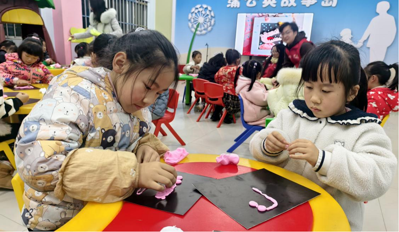 手工环节中,孩子们用彩色纸黏土亲手制作“爱哭公主”。大家认真揉捏、塑形,创作出各具特色的公主形象。有的捏出了带着微笑的公主,有的则塑造出正在思考或平静模样的造型。通过动手创作,孩子们不仅锻炼了手部协调能力,也将对情绪的理解融入作品之中,在捏塑过程中进一步感受“情绪可以表达,也可以转化”的温暖寓意。